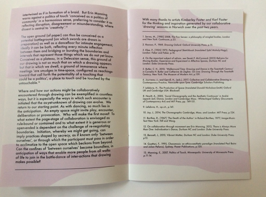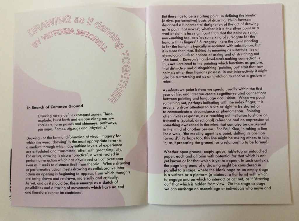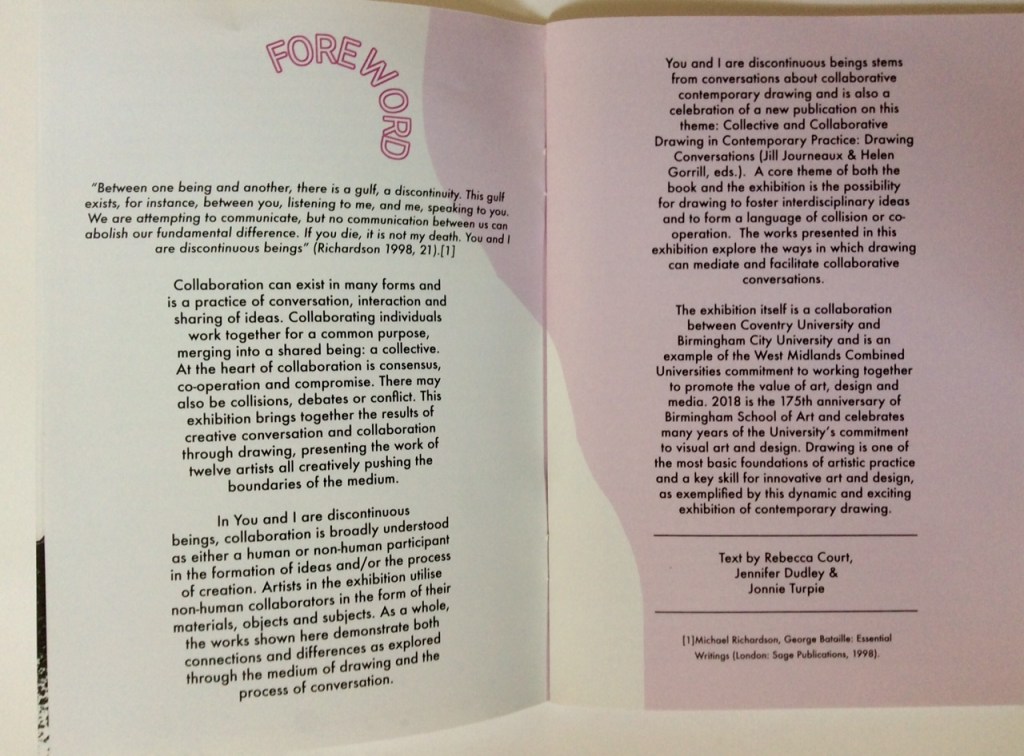 The exhibition was accompanied by the publication ‘you and i are discontinuous beings‘ which was edited by Jill Journeaux and Helen Gorrill and contains a forward by Rebecca Court, Jennifer Dudley and Jonnie Turpie. The catalogue essay ‘Drawing as if dancing Together‘ is by Victoria Mitchell.